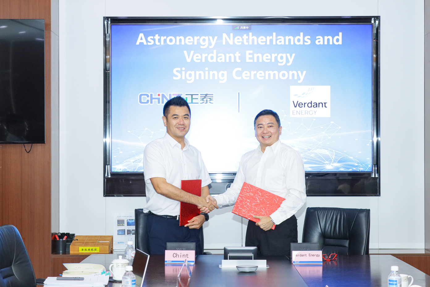 正泰新能源董事長陸川與Verdant Energy首席執行官(CEO)Alan Yau代表雙方簽約。Verdant Energy首席開發官(CDO)Diana Gao,項目總監白文軒以及正泰新能源海外電站事業部東南亞區域負責人干鵬共同出席簽約儀式。