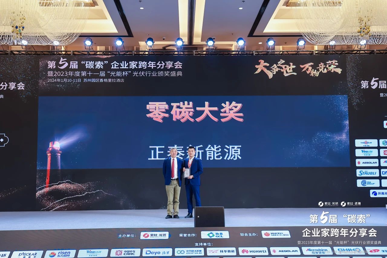 1月11日,由索比光伏網主辦的第五屆“碳索”企業家跨年分享會暨2023年度第十一屆“光能杯”光伏行業頒獎盛典在蘇州召開。200+家光伏產業鏈上下游企業齊聚一堂,共同探討技術創新、市場機遇、政策環境等行業核心議題,謀劃光伏行業的未來發展。正泰新能源董事長、正泰新能董事長兼總裁陸川受邀出席,回顧光伏行業二十年,暢談光伏產業穩健高質量發展之路。會上,浙江正泰新能源開發有限公司榮獲“零碳大獎”,陸川榮獲“光伏二十年功勛人物”。
