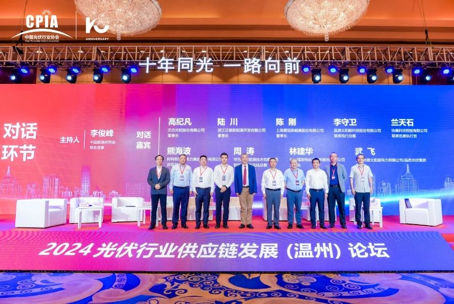 對話環(huán)節(jié)由中國能源研究會常務(wù)理事李俊峰主持。浙江正泰新能源開發(fā)有限公司董事長陸川與天合光能股份有限公司董事長高紀(jì)凡、上海愛旭新能源股份有限公司董事長陳剛、晶澳太陽能科技股份有限公司聯(lián)席執(zhí)行總裁李守衛(wèi)、協(xié)鑫科技控股有限公司聯(lián)席首席執(zhí)行官蘭天石、阿特斯陽光電力集團(tuán)股份有限公司高級副總裁熊海波、華為數(shù)字能源技術(shù)有限公司智能光伏產(chǎn)品線總裁周濤、杭州福斯特應(yīng)用材料股份有限公司董事長林建華、無錫尚德太陽能電力有限公司/晶優(yōu)光伏集團(tuán)董事長武飛出席對話環(huán)節(jié)。